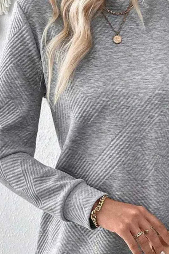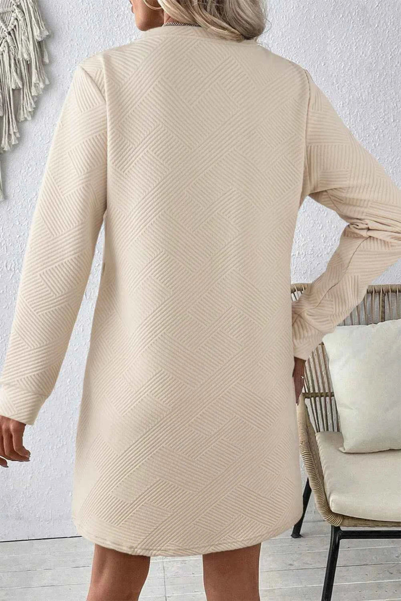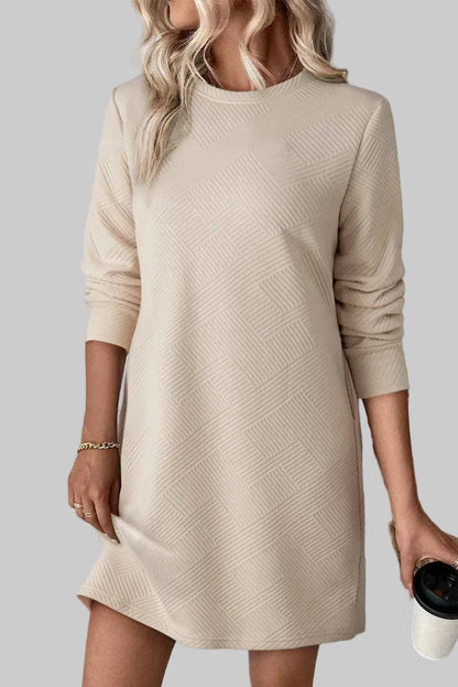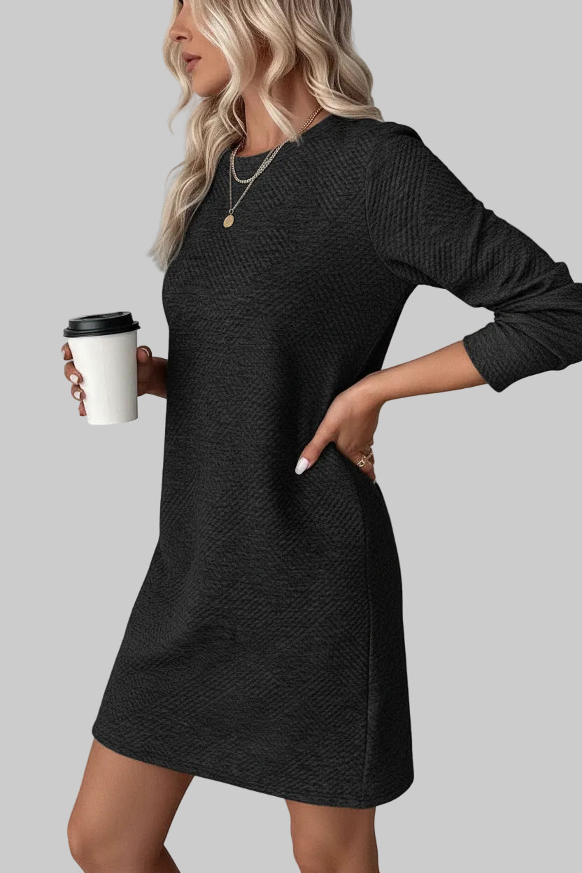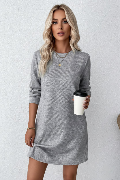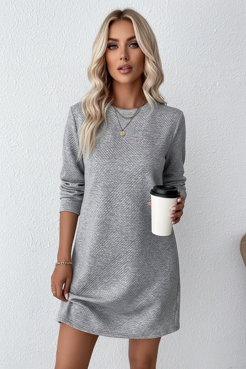 A polished, versatile mini dress that works harder than it looks. The textured fabric adds visual depth and dimension, while the classic round neckline and long sleeves keep it refined and wearable across seasons. The A-line silhouette flatters effortlessly — structured enough for professional settings, relaxed enough for casual outings. Available in Gray, Tan, Black, and Hot Pink.
